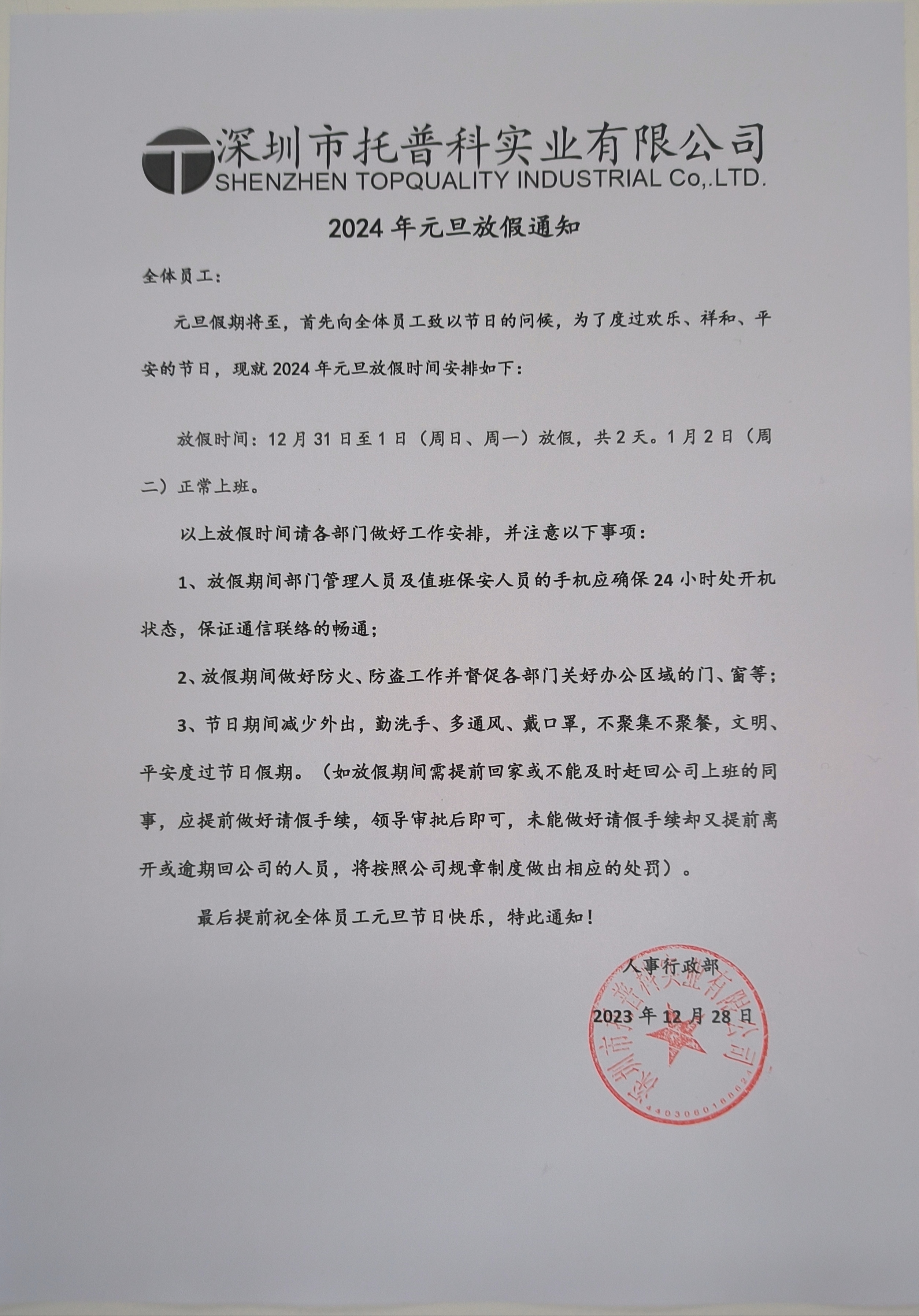 深圳托普科實(shí)業(yè)2024年元旦放假通知