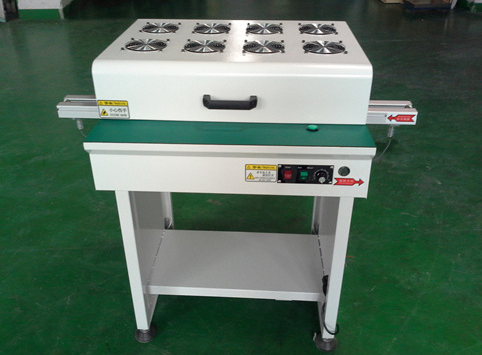 aoi位于smt生產(chǎn)線的后段,是通過接駁臺連接回流焊,因經(jīng)過回流焊高溫焊接(通常會達到220攝氏度),而在經(jīng)過冷卻區(qū)后,某些pcba板子的余溫還是比較高,因為在回流焊后面(即aoi前)加冷卻接駁臺,冷卻接駁臺顧名思義就是起到冷卻的作用,目的是為了加快剛焊接出來的pcba板降溫,相對于普通的接駁臺,就是在接駁臺上方加了許多的風扇,使pcba通過接駁臺的時候可以更快降溫。冷卻接駁臺如下圖所示